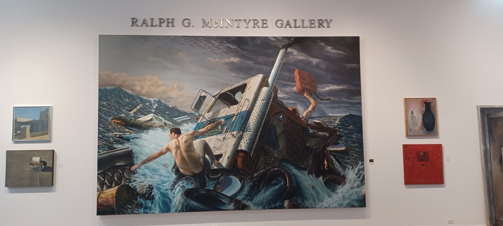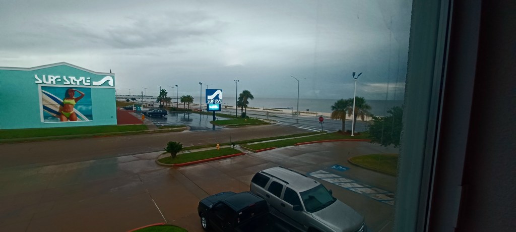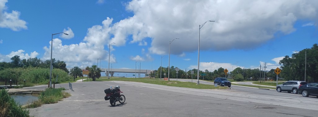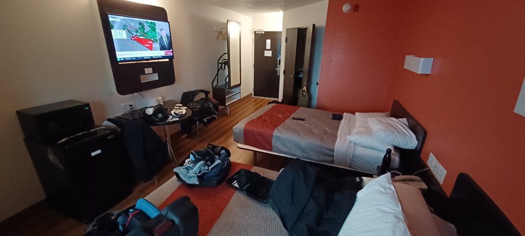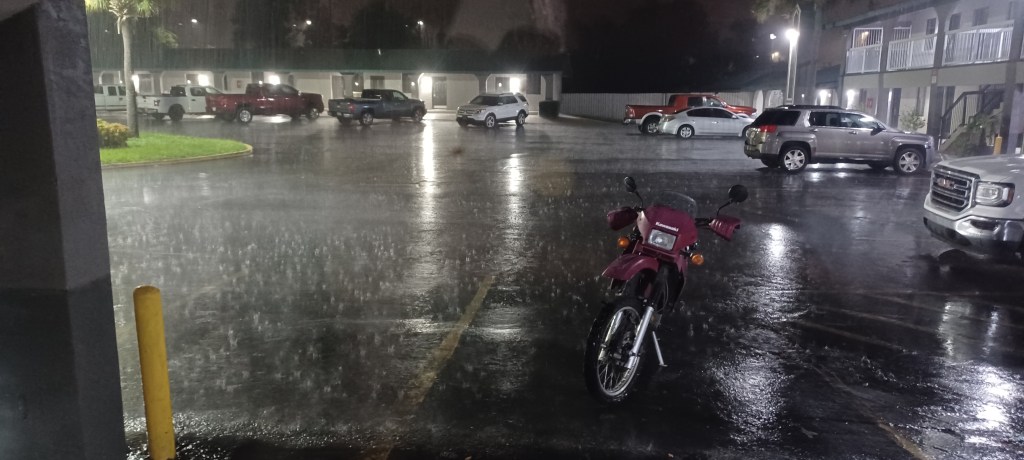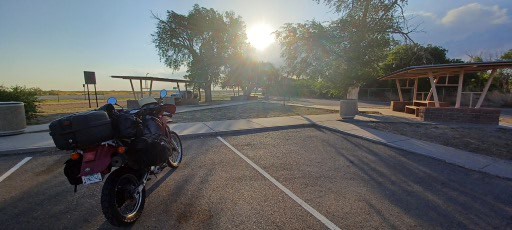 And then a sign for a rest stop, thank god! I pull in and… its closed. I stop anyway and park under the shade of what I can only generously describe as a large branch. I get out my hydro flask and greedily drink the remaining ice cold water: heaven. I now move on to the water from the water bladder stored on the back of the bike. It’s roasting hot, with a strange metallic after taste. It burns as it goes down my throat. I finish that, even though I don’t want to. I turn on the bike, zip up my jacket and I’m off. The oven door opens, its 108 degrees.
